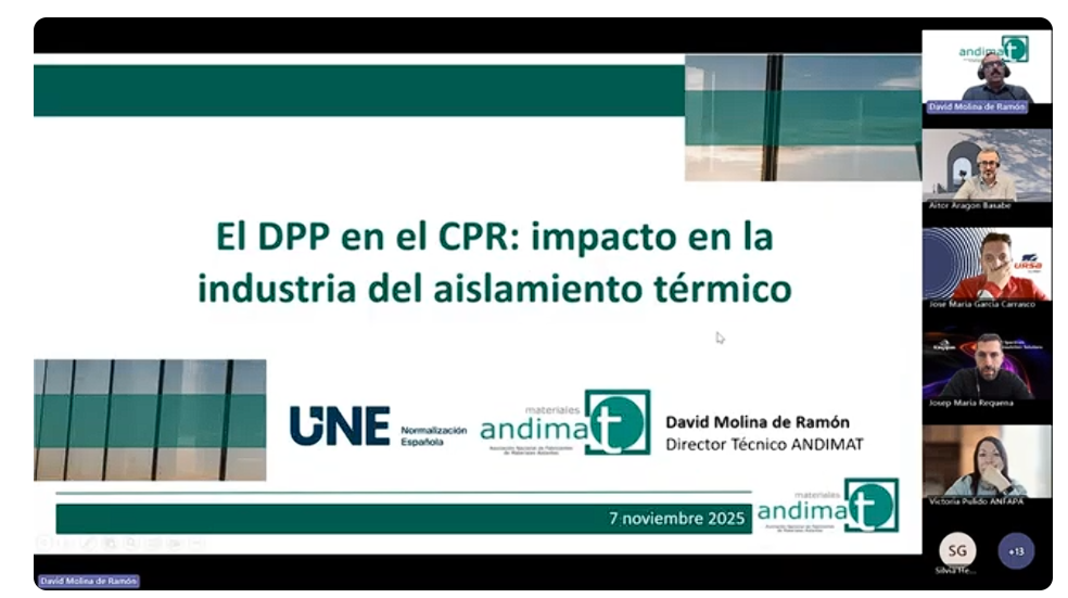 El pasado 7 de noviembre, Andimat y UNE organizaron la jornada “El pasaporte digital de producto (DPP) en el Reglamento Europeo de Productos de la Construcción (CPR): impacto en la industria del aislamiento térmico”. Durante esta jornada, Aitor Aragón, de Construcción sostenible y BIM de UNE, y David Molina, director Técnico de Andimat informaron sobre […]